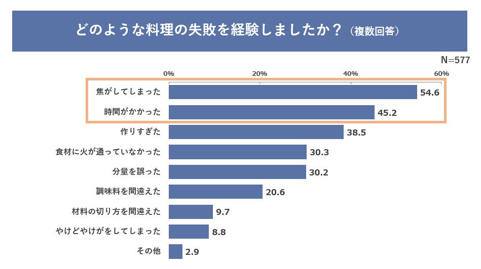 ・一人暮らしの失敗あるある1位は「焦がしてしまった」54.6%、2位「時間がかかった」45.2%。