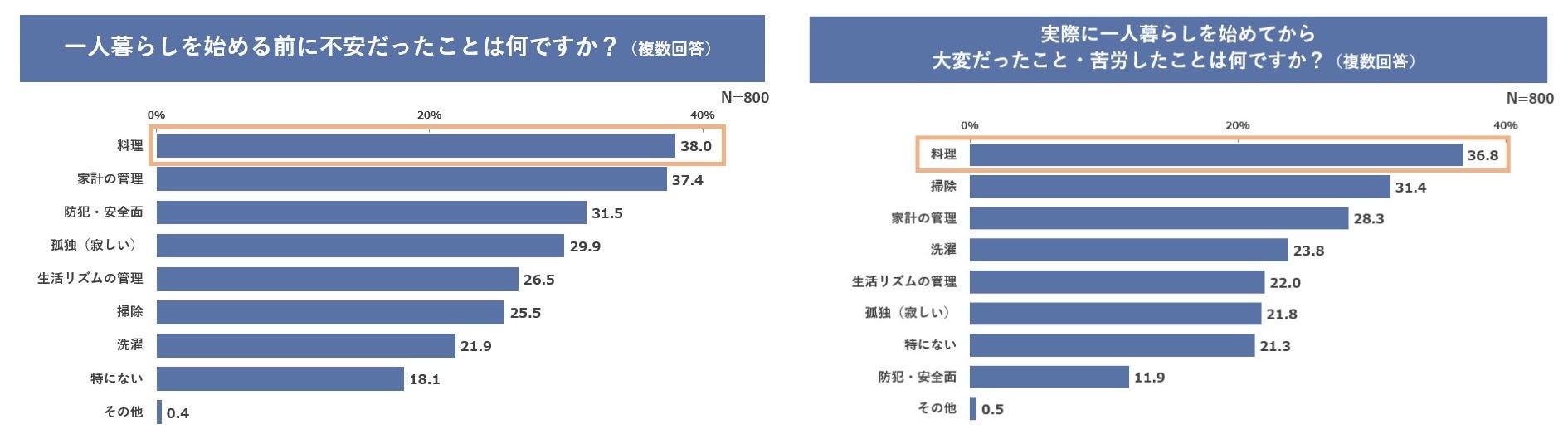 はじめに、一人暮らしを始める前の不安と、実際に一人暮らしを始めてから大変だったことについて聞いたところ、どちらも1位は「料理」という結果になりました。一人暮らしの料理は不慣れな中、全て自分で担うため何かしらの困難に直面している様子がうかがえます。
