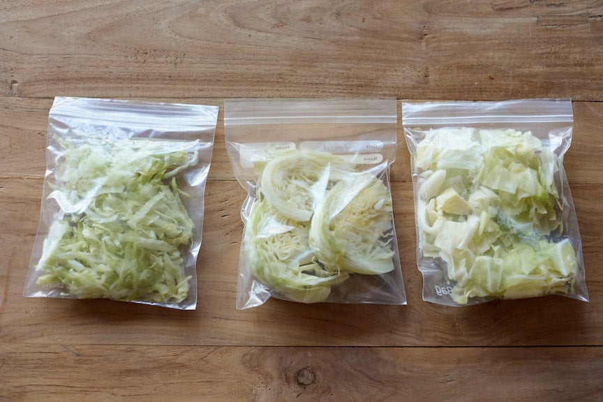 キャベツは、丸ごと保存するには冷蔵室内で場所をとってしまいますが、すぐに使わない分は好みの大きさに切って冷凍保存しておくと、使いたいときにすぐに使えて便利。