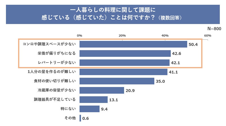・一人暮らしの料理の課題トップ3は「コンロや調理スペースが少ない」「栄養が偏りがちになる」「レパートリーが少ない」