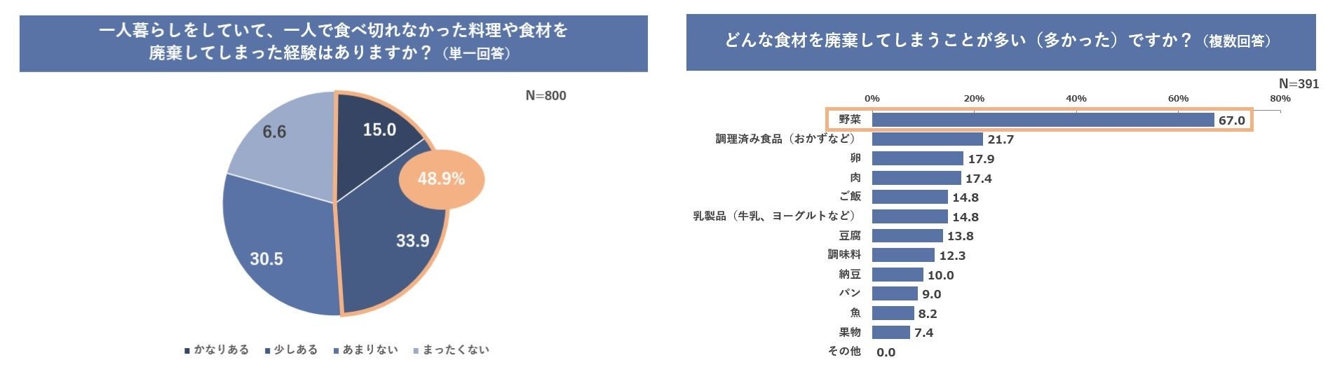 一人で食べ切れなかった料理や食材を廃棄した経験がある人は約半数に上る。買ったものの使い切れなかったことが多い食材は圧倒的に「野菜」が多く67%に