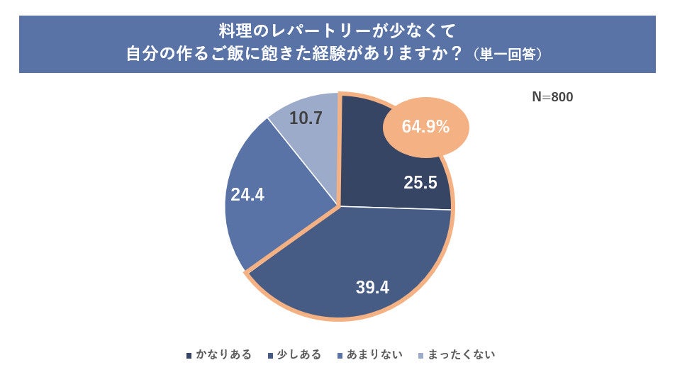 レパートリーが少なくて自分の作る料理に飽きた経験があるかどうかを聞いたところ、「かなりある」と「少しある」を合わせると64.9%という結果となりました。一人分の料理に手間をかけることへの躊躇や、新しいレシピに挑戦する余裕のなさから、メニューがワンパターンになってしまうことに悩んでいる状況がうかがえます。