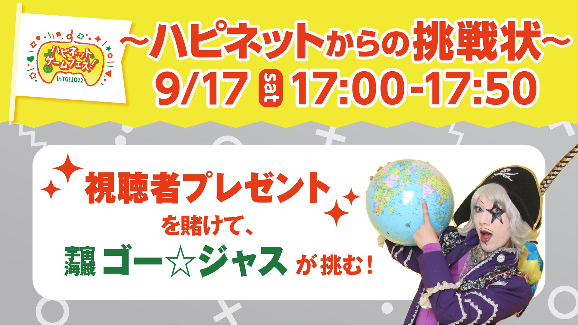 TGS2021に引き続き、今年も宇宙海賊「ゴー☆ジャス」さんをゲストに迎えて、「ハピネットからの挑戦状」にチャレンジしていただきます。はたして、ゴー☆ジャスさんはすべてのミッションをクリアし、視聴者プレゼントを獲得することができるのでしょうか!