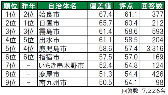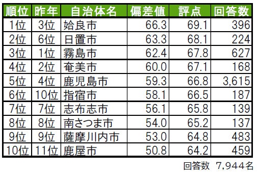 姶良市が、昨年2位から順位を上げて1位に輝きました。2位は日置市、3位は3年連続で霧島市となっています。トップ3は、「街の幸福度」および「街に誇りがある」のトップ3と全く同じ自治体が並ぶ結果となっています。