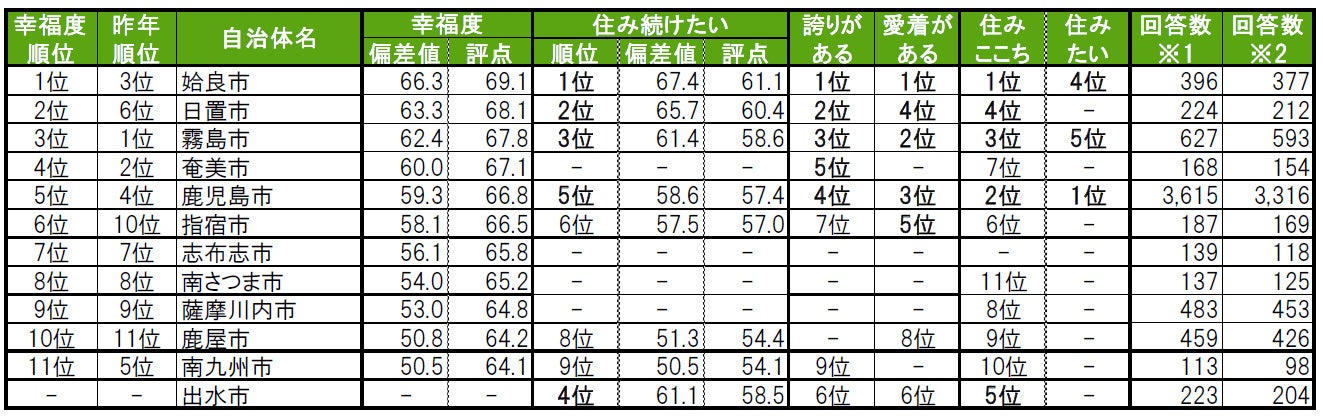 街の幸福度は、1位姶良市、2位日置市、3位霧島市。