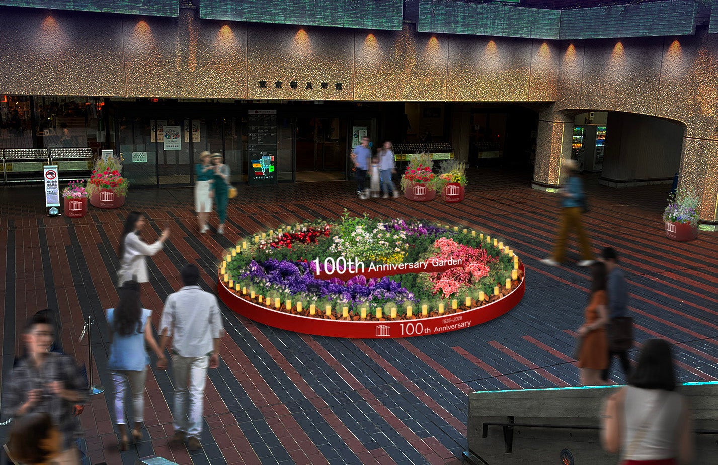 開館100 周年を祝い、中庭に直径5m のアニバーサリー・ガーデンが出現します。円が連なり「縁」や「繁栄」を意味し、お祝いの文様として知られる七宝文様をモティーフに、色とりどりの花でエントランスを彩ります。開館記念日の5月1日(金)の夜間にはLEDキャンドルによる ライトアップを実施。