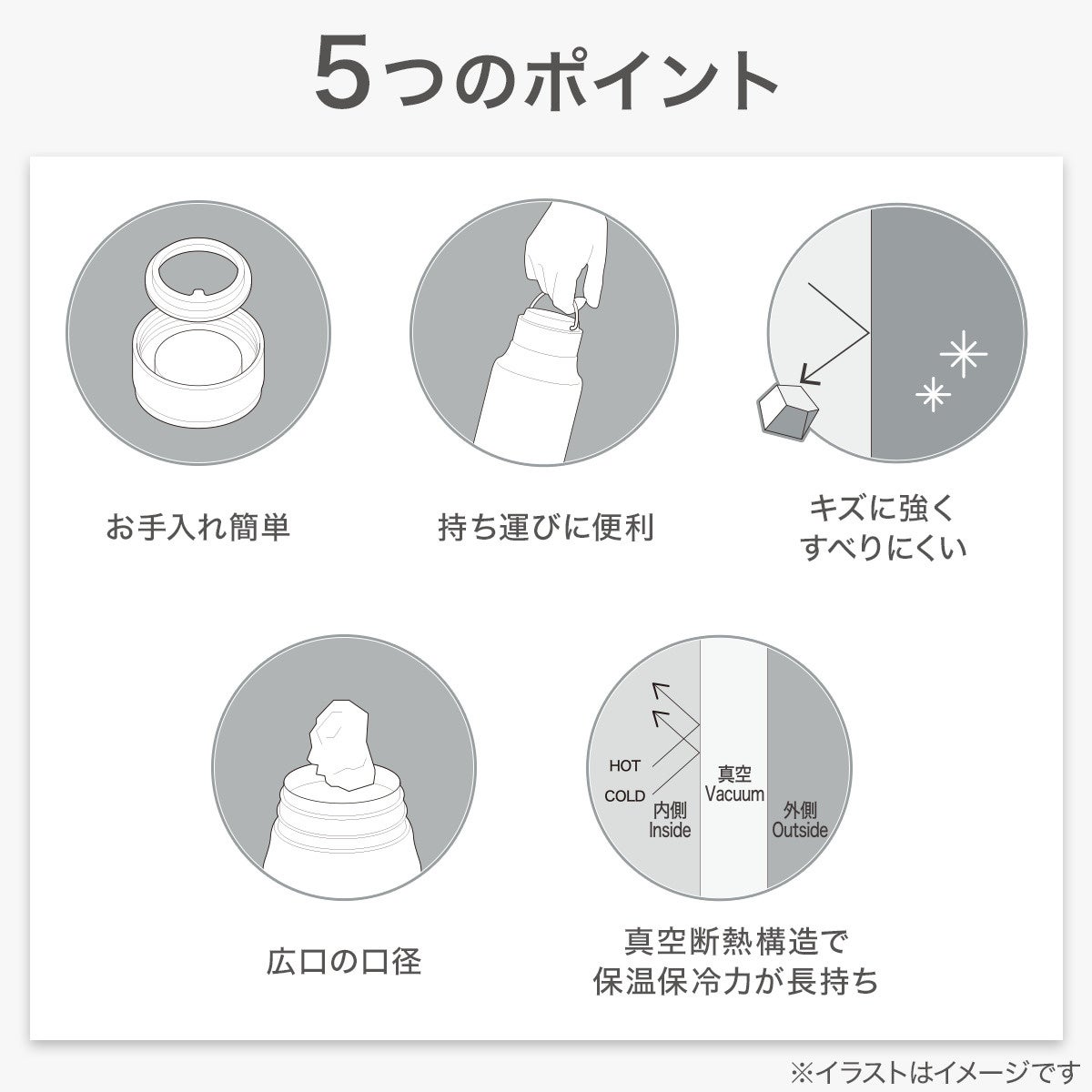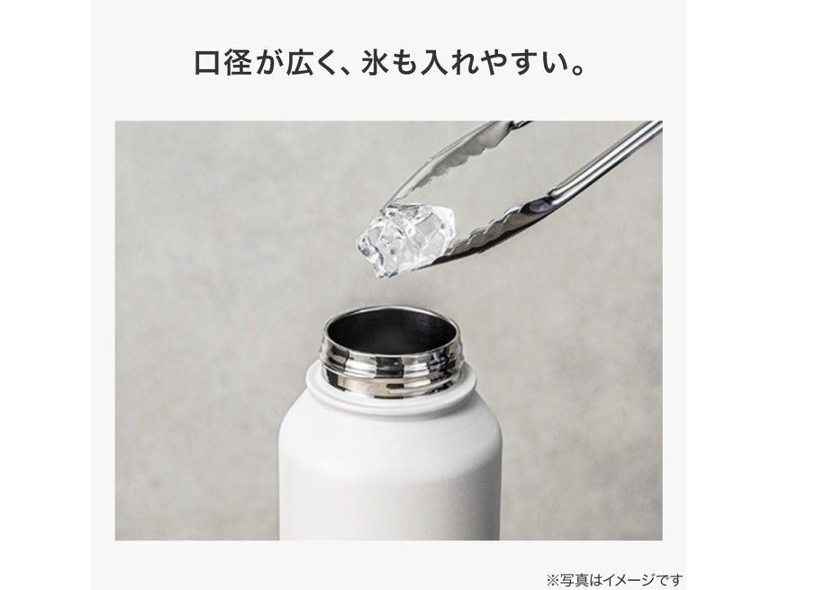 氷や飲み物を入れやすい広い口は、洗いやすさも兼ね備えています。ボトルの内部に指やスポンジを入れやすく隅々までしっかり洗えるため、いつも清潔にお使いいただけます。