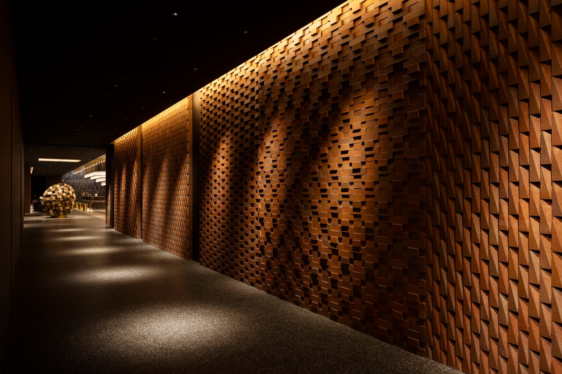 29階のロビーフロアへ降り立つと、ゲストを迎えるのは重厚感のある煉瓦積みの回廊。初代大阪駅に用いられた煉瓦の積み方であるフランス積や、見たことのないような積み方を並べることで、過去から未来へとつながるストーリーを表現。
