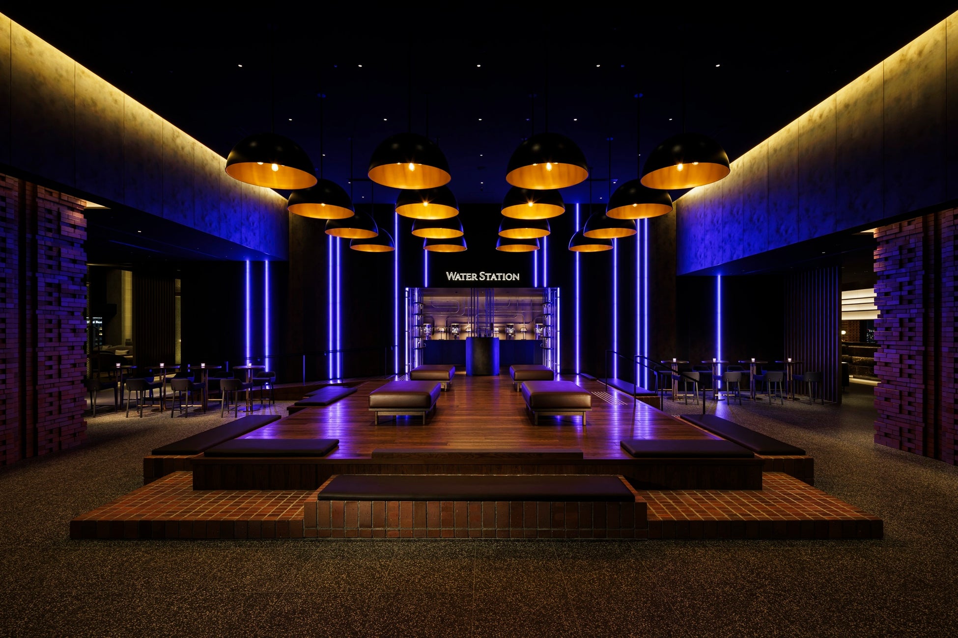 パブリックエリアの中央には、駅の待合室や駅前広場のような空間(ステーションスクエア)が広がる。昼と夜で光色が変化してドラマティックな表情を見せる中、人々が行き交い思い思いに佇むことができる。 Photo: ナカサ&パートナーズ