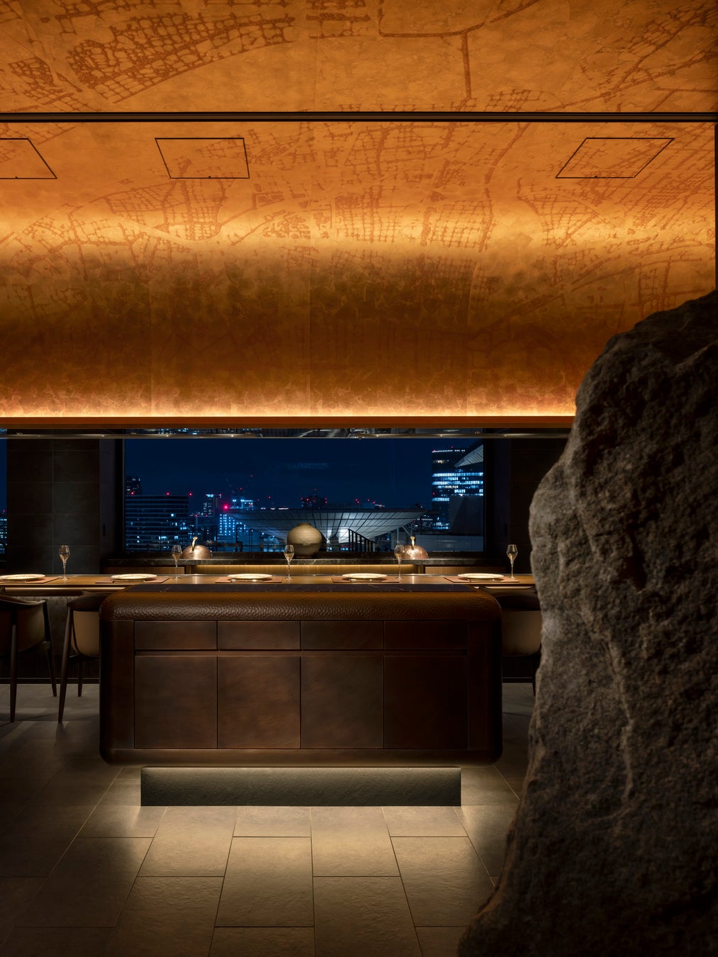 “天下の台所”と謳われ、全国の産品の大集積地であった大阪の食文化の豊かさを表現する「鉄板焼 瑞」。天井は大阪の地図を描いた銅箔アート。景石は日本の銘石である庵治石。 Photo: ナカサ&パートナーズ