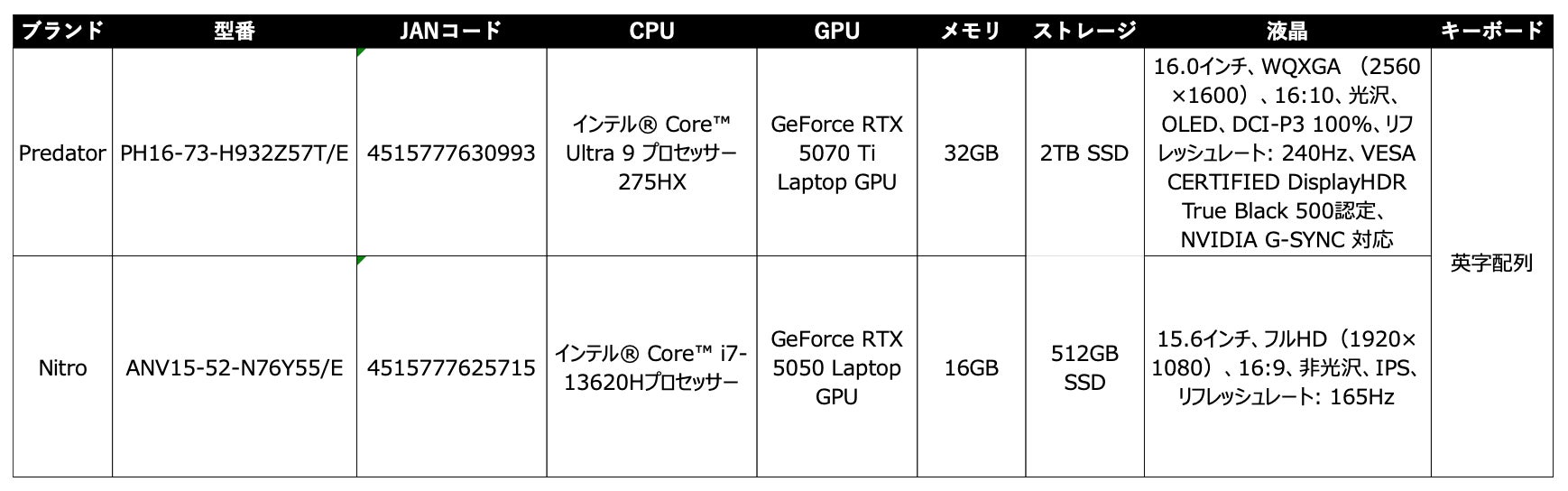 Predator、Nitroシリーズから量販店販売モデルを拡充!Predator Helios 16AI 、 Acer Nitro V 15発売!