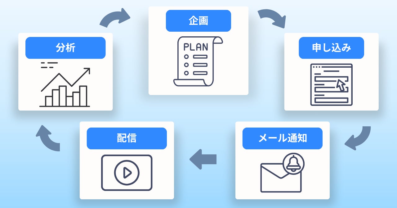 企画・フォーム作成・メール通知からオンデマンド配信・視聴データ分析まで、追加ツールなしで実行可能。複雑な連携設定が不要なため、マーケチームの生産性を保ったまま新機能を取り入れられます。