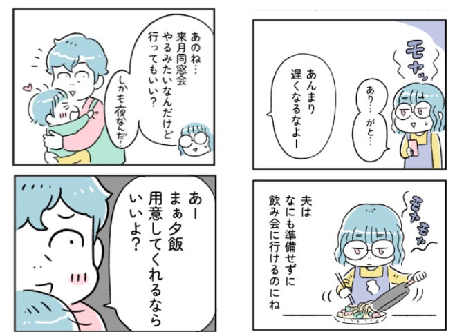 意識や思い込みは大きな問題で、女性側が「自分がやらなければ」と背負いこんでしまっているケースもありそうです。例えば、第3話に「飲み会に行きたい」という妻に、夫が「いいよ、夕飯用意してくれるなら」と発言する一コマがありました。このシーン、妻が「その日はお弁当を買うとか、自分でなんとかしてもらえないかな。」とか言い返していいだろう、と僕は思うんです。でもこの主人公のように「そうだよね」と自身で抱えこんでしまう現実は多いはずです。