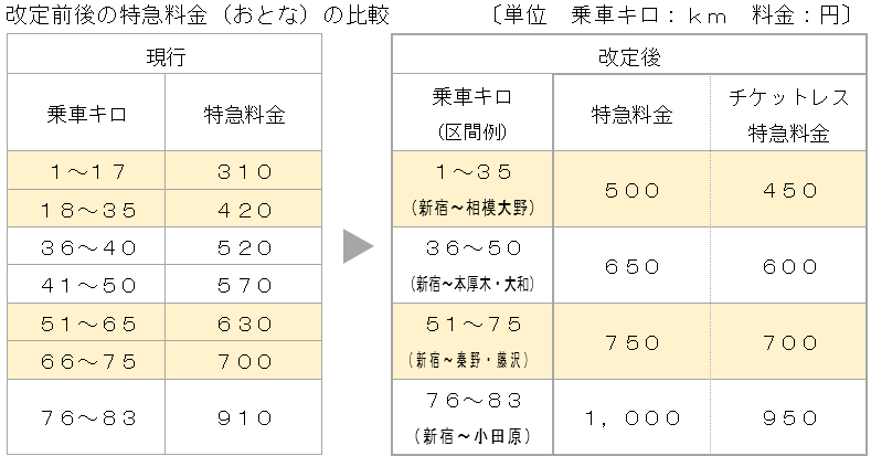 ※現行の特急料金に対して、本厚木-小田原間、相模大野-片瀬江ノ島間における18キロから35キロまでのご利用と、新百合ヶ丘-大和間(18.4キロ)のご利用時に別途設定している「特定特急料金」は、料金改定にあわせて廃止します