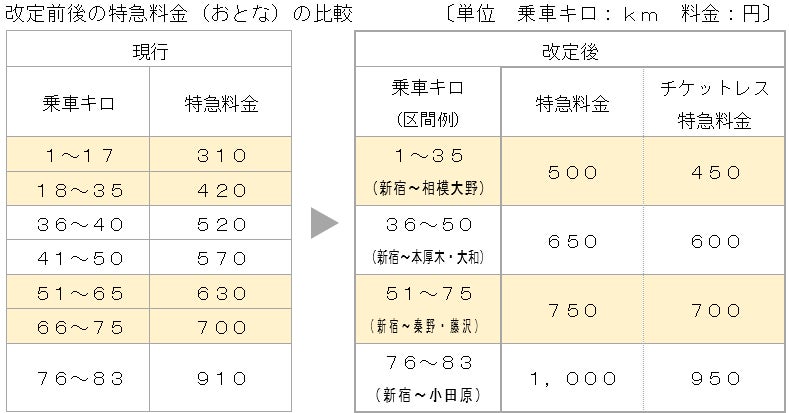 乗車距離に応じた特急料金の平均改定率は22.2%として、主な区間では、新宿-町田間の料金は420円から500円に、新宿-小田原間では910円から1,000円とするほか、料金区分を7区分から4区分に変更します。