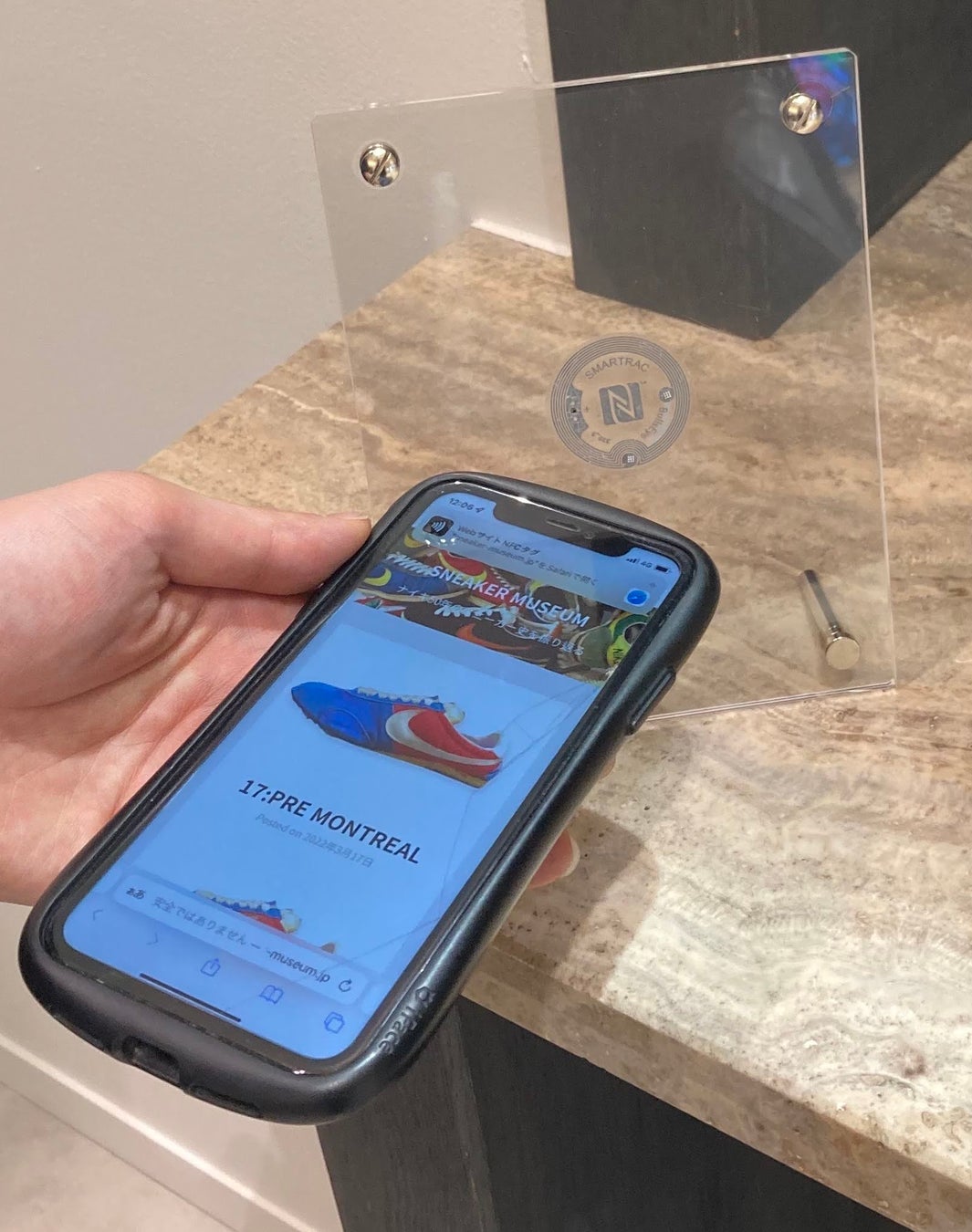 従来の展示はアイテムのみが主流でしたが、過去に阪急メンズ東京でご好評頂いた「SNEAKER MUSEUM by KCKC」でも実施したRFIDやブロックチェーンなどのテクノロジーを活用した「読めるスニーカー」の仕組みを、より博物館をイメージした形で「スニーカーガイド」として実施しております。お手持ちのスマートフォンをかざすだけで展示しているスニーカーの詳細をご覧頂けます。是非現地にてお楽しみ下さい。