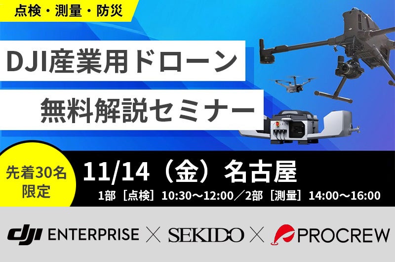 DJI(ディージェイアイ)正規販売代理店としてドローンビジネスの最先端を支える株式会社セキド(本社:東京都港区、代表取締役:大下貴之)は、株式会社プロクルー(本社:滋賀県長浜市、代表取締役:酒井正裕)と共催し、2025年11月14日(金)に愛知県名古屋市で「産業用ドローン 点検/防災/ICT施工/測量 無料解説セミナー」を開催します。