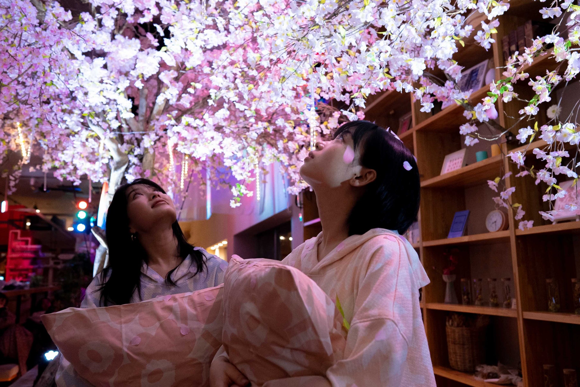 暖炉ラウンジには巨大な桜ツリーが登場。毎週末の18:30からは館内が暗くなり、イルミネーションのなか桜吹雪が舞い散る「夜桜chillタイム」も開催。オーロラの光とピンクの桜が光り輝く幻想的な空間が広がります。