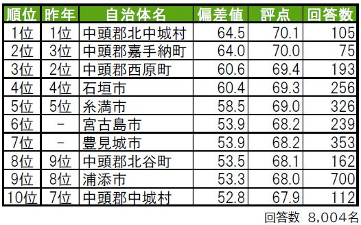 1位は2年連続で中頭郡北中城村で、「住み続けたい街」「街に誇りがある」「街に愛着がある」で3位、「住みここち」では4位と各ランキングで上位に入っています。2位は中頭郡嘉手納町で、「住み続けたい街」1位、「街に誇りがある」「街に愛着がある」2位となっています。3位は、中頭郡西原町です。トップ3は中頭郡に属する自治体で、さらに8位に北谷町、10位に中城村も入っており、トップ10のうち半数が中頭郡の「町村」となっています。
