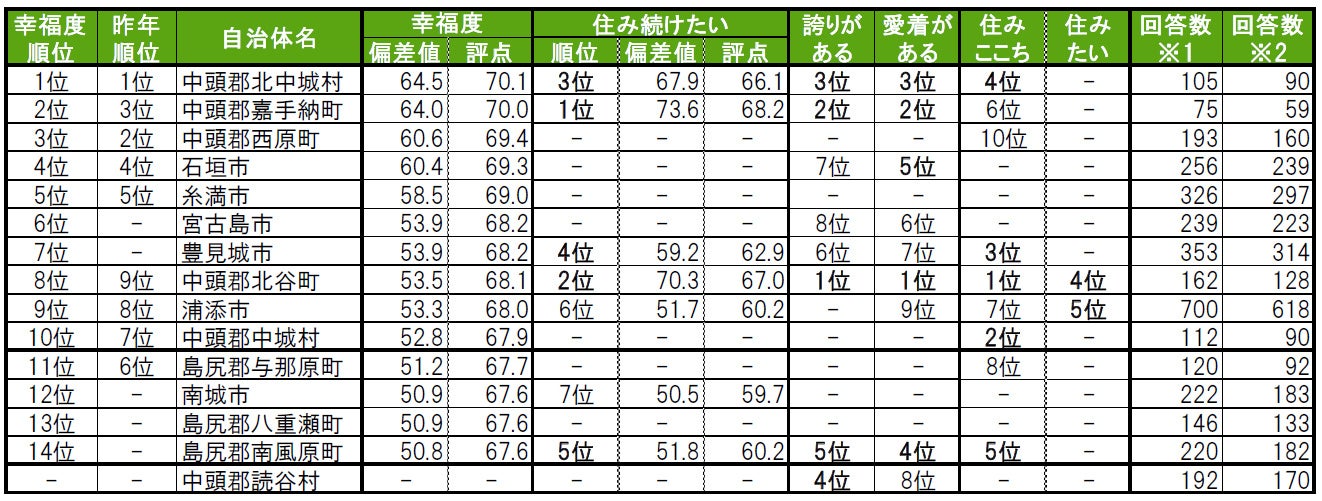 街の幸福度1位は、2年連続で中頭郡北中城村。2位中頭郡嘉手納町、3位中頭郡西原町。