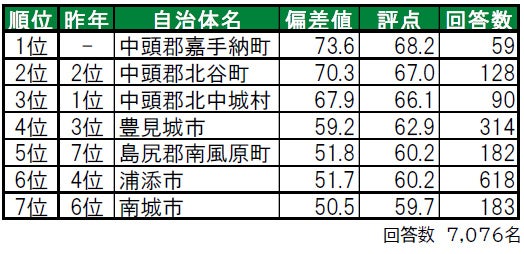1位は中頭郡嘉手納町で、「街の幸福度」「街に誇りがある」「街に愛着がある」では2位となっています。嘉手納町は、昨年は累計回答数が50名未満でランキング集計対象外でした。2位は2年連続で中頭郡北谷町で、「住みここち」「街に誇りがある」「街に愛着がある」1位、「住みたい街」4位と、各ランキングで高い評価を得ています。3位は中頭郡北中城村で、「街の幸福度」で1位など、各ランキングで上位に入っています。トップ2の町は、偏差値70台の極めて高い評価を得ています。