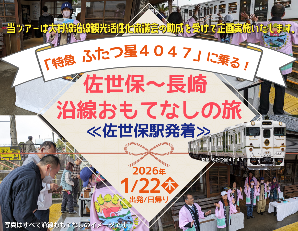 JR九州は、大村線沿線観光活性化協議会(以下、協議会)と連携し「特急 ふたつ星4047」を使用した佐世保駅~長崎駅間の往復特別運行によるオリジナルツアーを発売中です。ツアー当日は、協議会に所属する7つの市町(長崎市・佐世保市・諫早市・大村市・長与町・東彼杵町・川棚町)のおもてなしを停車駅や車内にてお楽しみいただけます。ぜひこの機会に「特急 ふたつ星4047」で佐世保~長崎の旅に出かけてみませんか? 皆さまのご参加をお待ちしております。
