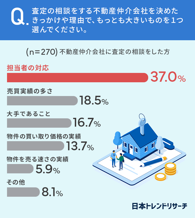 37%の方が「担当者の対応」で査定の相談先の不動産仲介会社を決めた、と回答しています。