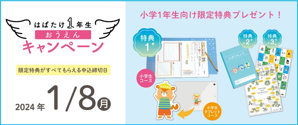 申込受付の開始と同時に、ご受講コースに応じた期間限定特典を差し上げる「はばたけ1年生おうえんキャンペーン」も実施中!