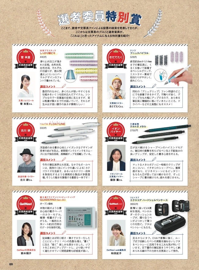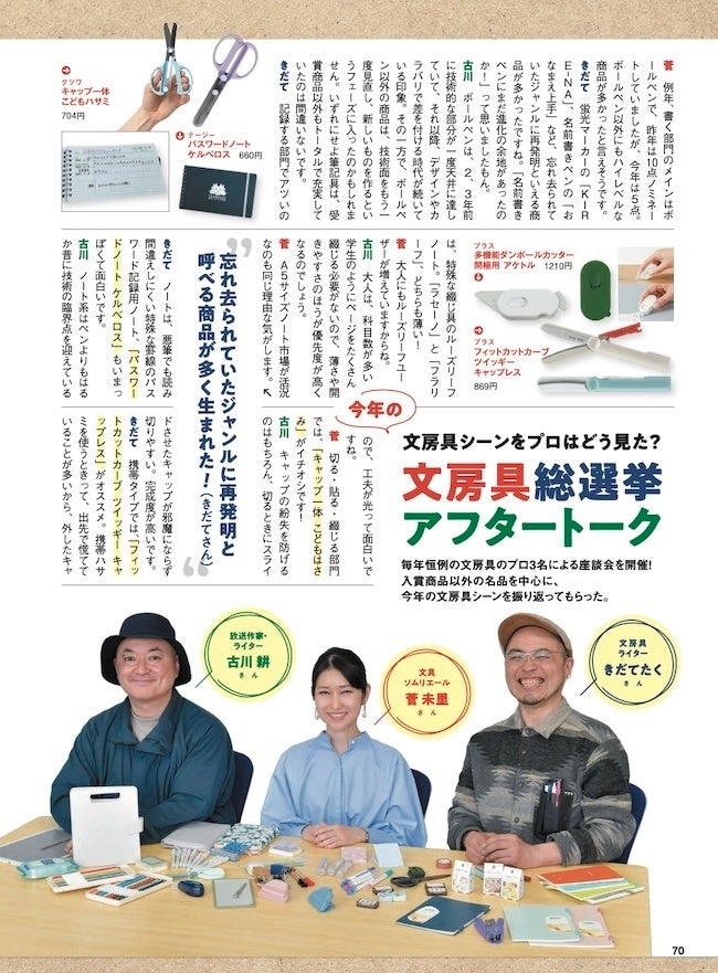 さらに『GetNavi』2025年7月号には、選考委員3名(菅さん、きだてさん、古川さん)によるアフタートークも掲載。入賞は逃したものの、多くの人に知ってほしい商品を取り上げるとともに、プロならではの目線で文房具の“いまと今後”を解説しています。
