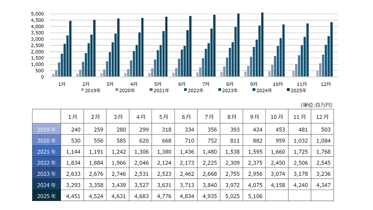 (注)決済手段により3か月毎に1か月の日数(通常月は28営業日、特別月は35営業日)に変動があること、四半期決算期末月毎に決算調整を行っていること等から、月次では金額が変動するため、3か月移動平均を採用しております。