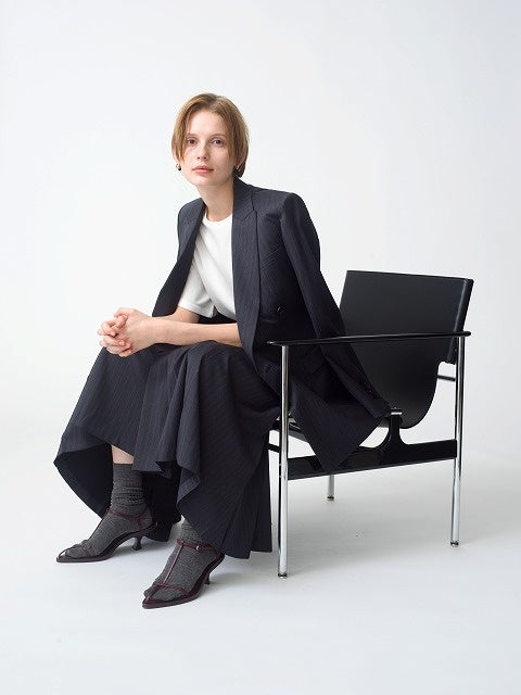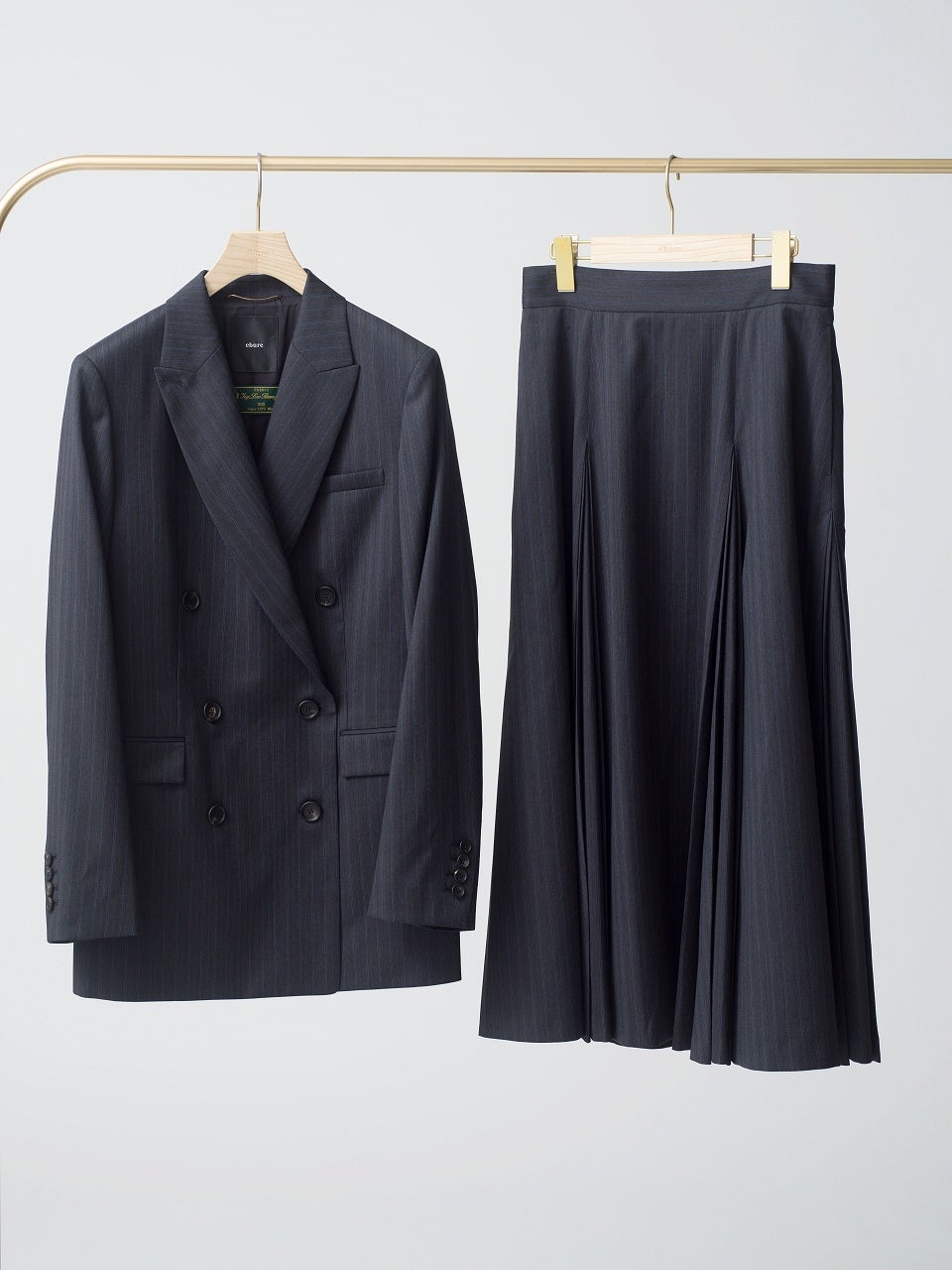 ジャケットはウエストを緩やかに絞り、スカートにはたっぷりのプリーツを入れてマニッシュな雰囲気の