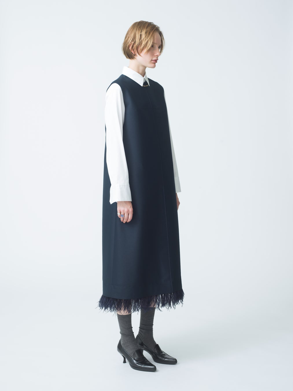 11月10日(金)からブライトシルクウールシリーズを伊勢丹新宿店先行発売予定。取り外しのできるオストリッチの羽が裾についたフェミニンな雰囲気のワンピースやジレ、センタープレスのテーパードパンツを展開します。(11月10日(金)伊勢丹新宿店先行発売予定)