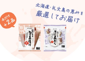 キャンペーン中の「おためしセット」では、ボイルするだけの煮魚など魚介5品を詰め合わせた「魚を愉しむおためしセット」を購入すると魚好きから好評の「礼文島船泊の産直・旬の真ほっけ切身干し」「礼文島船泊の産直・生からつくった真だら切身(骨とり)」の2品を追加して届けます。