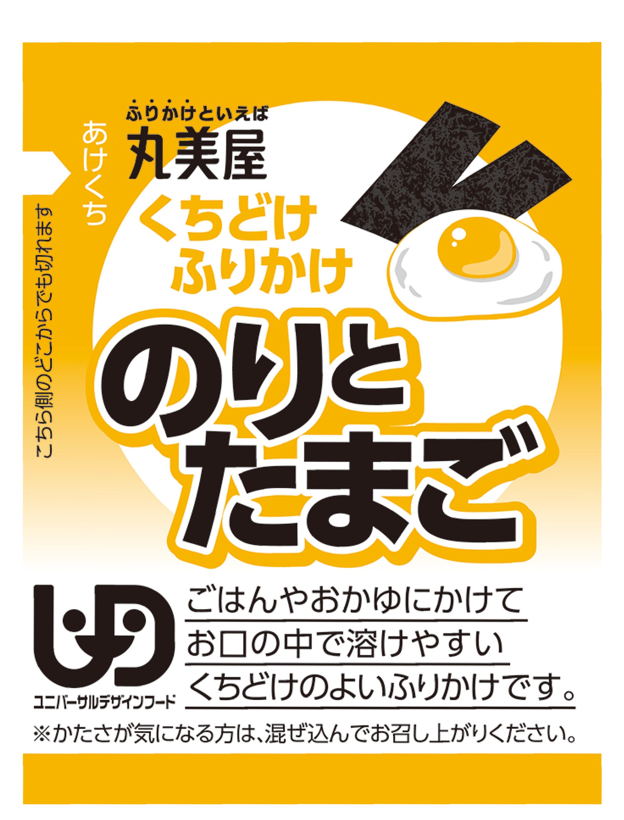 「くちどけふりかけ<のりとたまご>」は 2024 年10 月に発売した、UDF※拡張規格を取得した商品です。海苔顆粒とたまごの絶妙なバランスで食べやすさに配慮し、「刻み海苔」「削り節」「粒ごま」を不使用。海苔は粉末にして顆粒に練り込んでいるので、口の中に溶け残らずに安心して海苔の風味をお楽しみいただけます。また開封しやすい「どこでもカット」を採用しております。