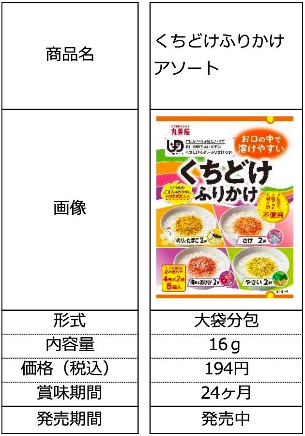 高齢者の低エネルギーを改善し、おいしく食べて QOL(クオリティ・オブ・ライフ)の向上を目指して開発した商品で、「のりとたまご」「さけ」「梅風味おかか」「やさい」の 4 商品をラインアップ。くちどけふりかけの商品特徴は、口の中で完全に溶ける、ごはんがすすむしっかりとした味付け、歯にはさまりやすい材料不使用、どこでもカットの採用、ふりかけ史上初の UDF 規格の承認を取得しているという点です。いつもの食事に彩りやバリエーションを付与でき、さらに安心してご利用いただけます。