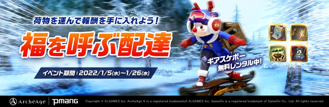 株式会社ゲームオン[本社:東京都渋谷区、代表取締役社長:李 相燁(イ サンヨプ)] は、超大型MMORPG『ArcheAge(アーキエイジ)』において、2022年1月5日(水)より、荷物を運ぶと“福袋”が手に入るイベント「福を呼ぶ配達」を開始いたしました。