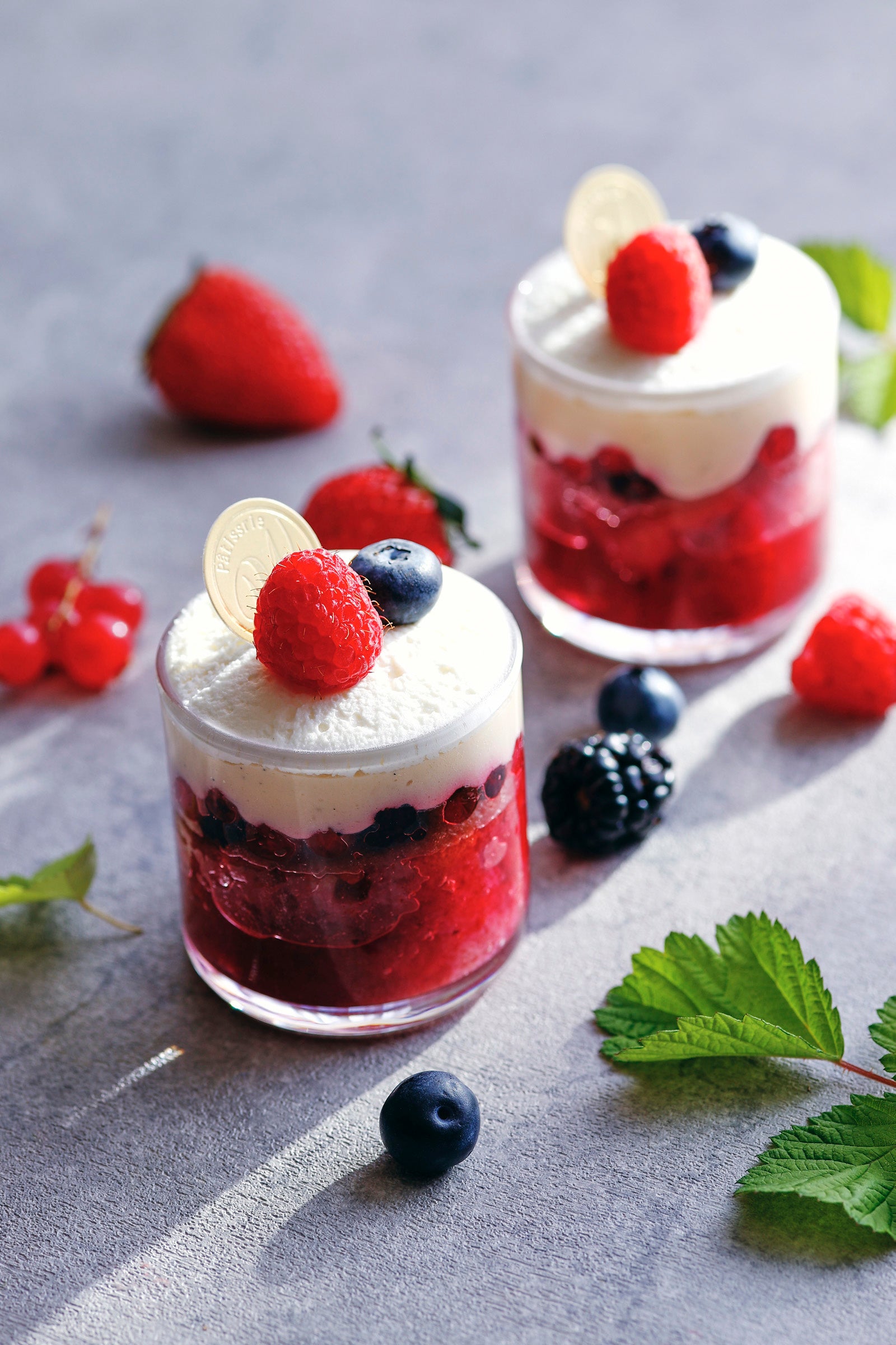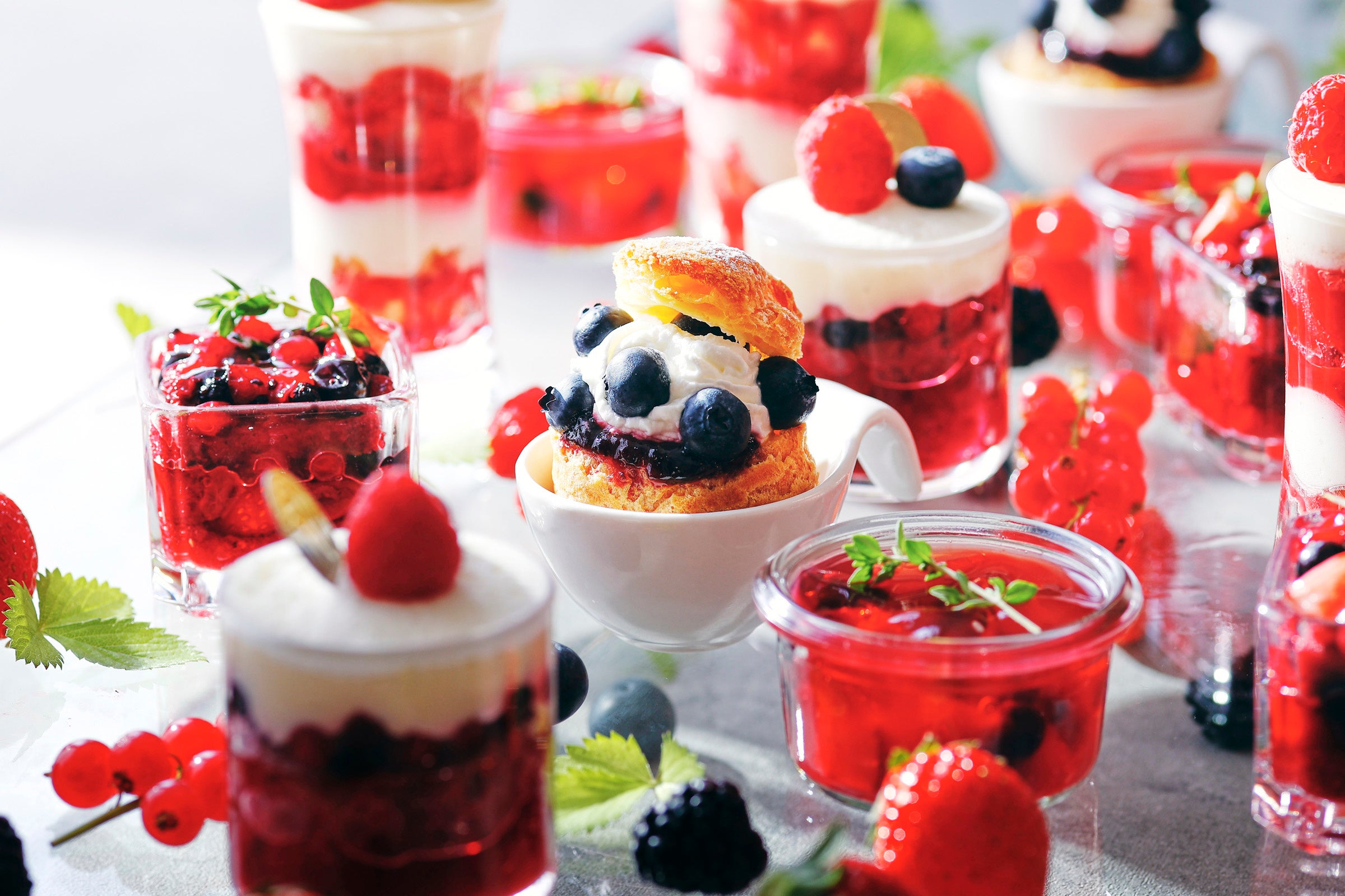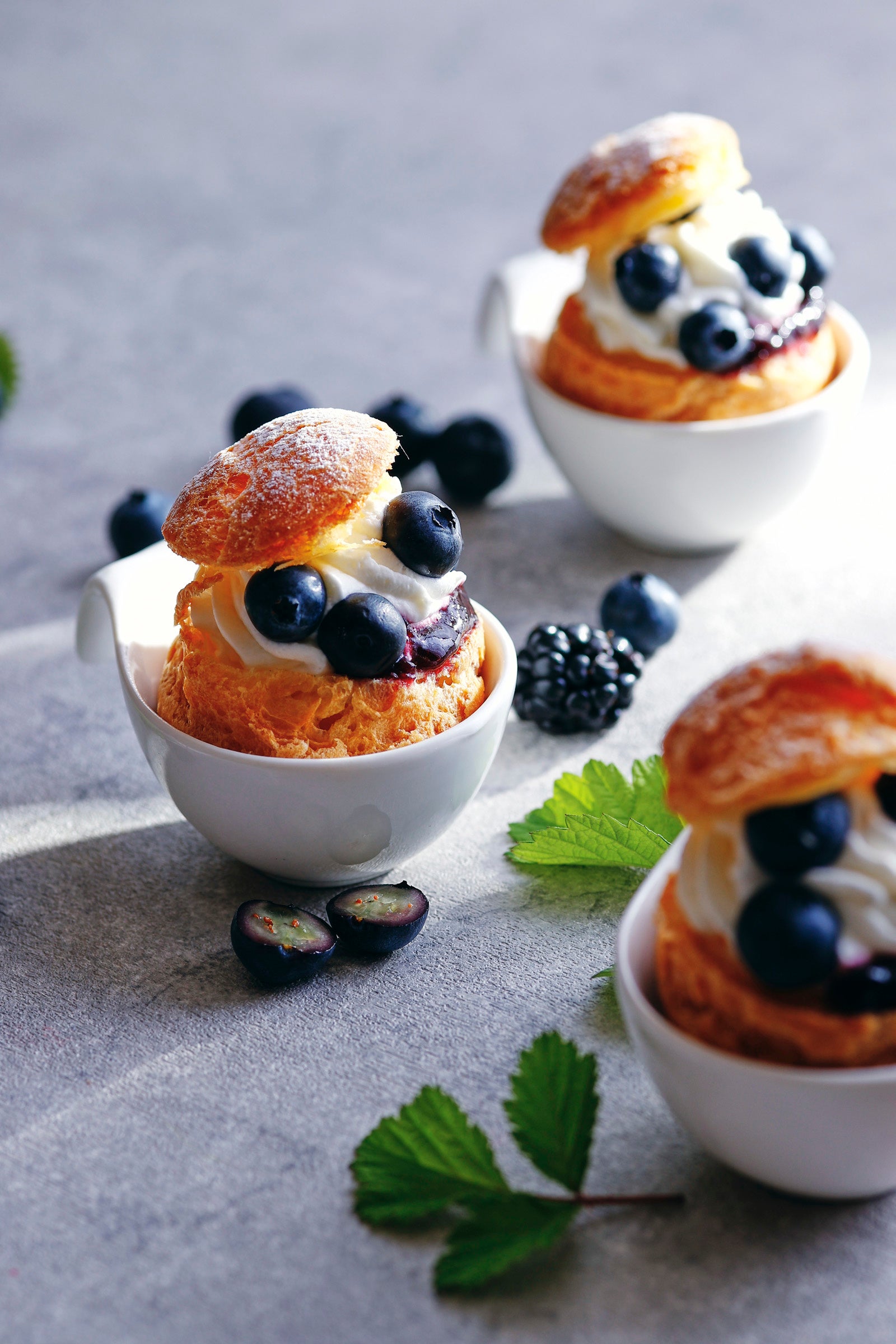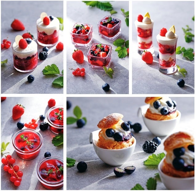 下段左から:ミックスベリーとエルダーフラワーのゼリー、ブルーベリーのシュークリーム