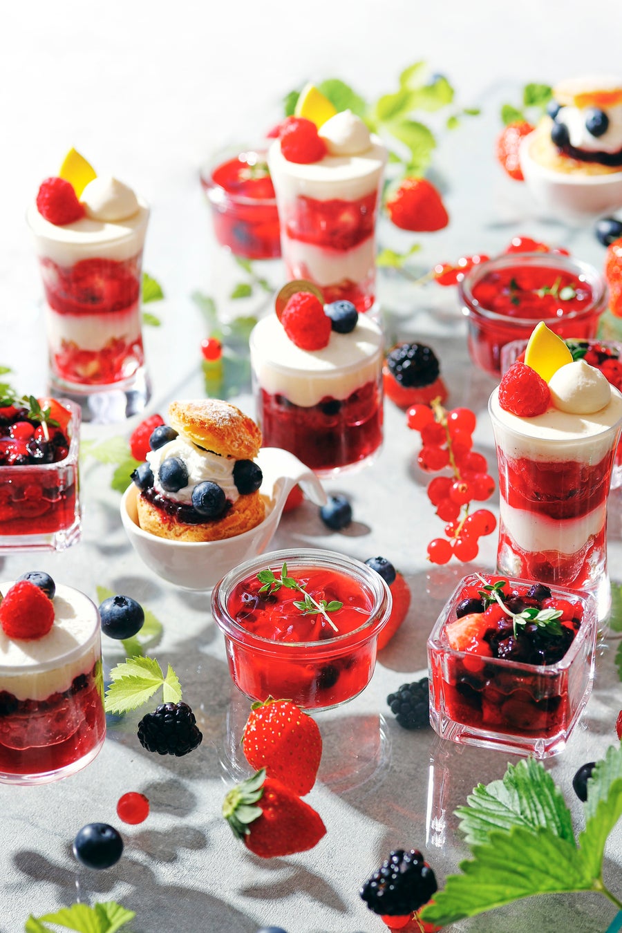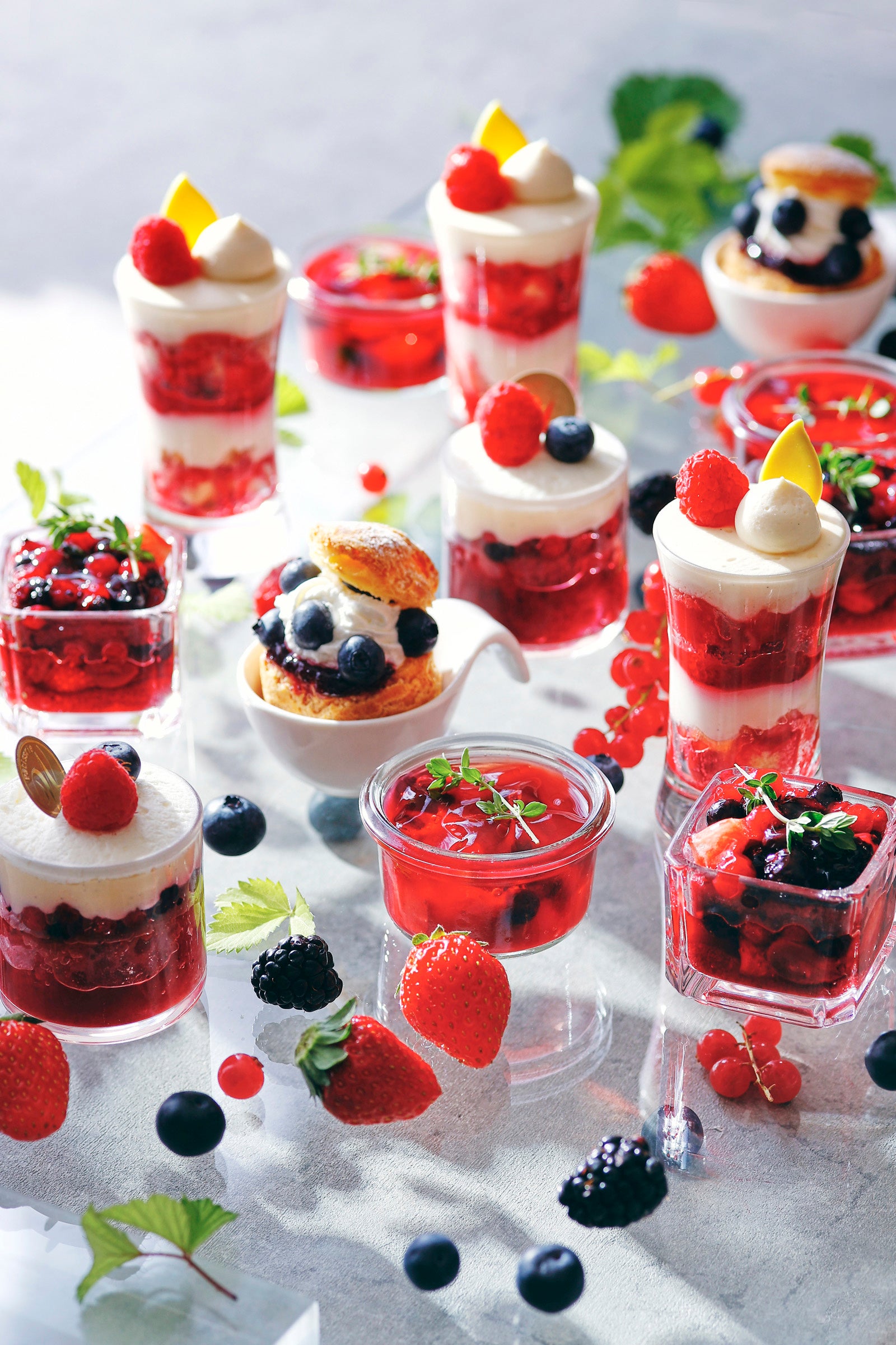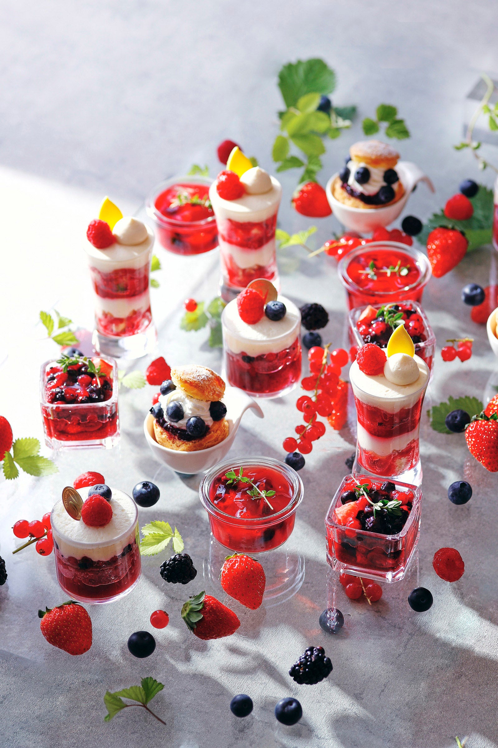 真赤なベリーにエルダーフラワーを香らせたエレガントなゼリーや、ラズベリーにレモンを合わせて爽やかに仕上げたショートケーキ、様々なベリーのマリアージュを楽しむ深紅が鮮やかなプディング、ブルーベリーと紅茶が香るトライフルなど、素材を美しく重ねたグラスデザートから、ベリーとチーズを絶妙なバランスで合わせた焼き菓子、ベリーの甘酸っぱさにココナッツを添えたスープ、ヨーグルトとベリーが風味豊かに響き合うドリンクまで、エグゼクティブペストリーシェフが一つひとつの素材を丁寧に組み合わせて創り上げたクリエイティビティ―溢れるデザートが、まるで宝石のように彩り鮮やかにブッフェ台いっぱいに並びます。