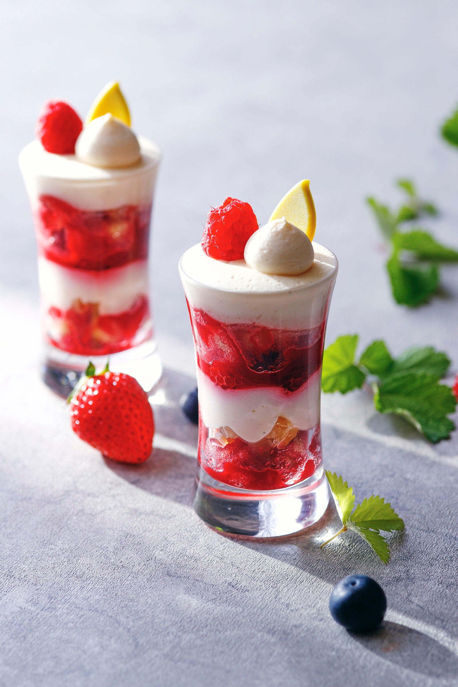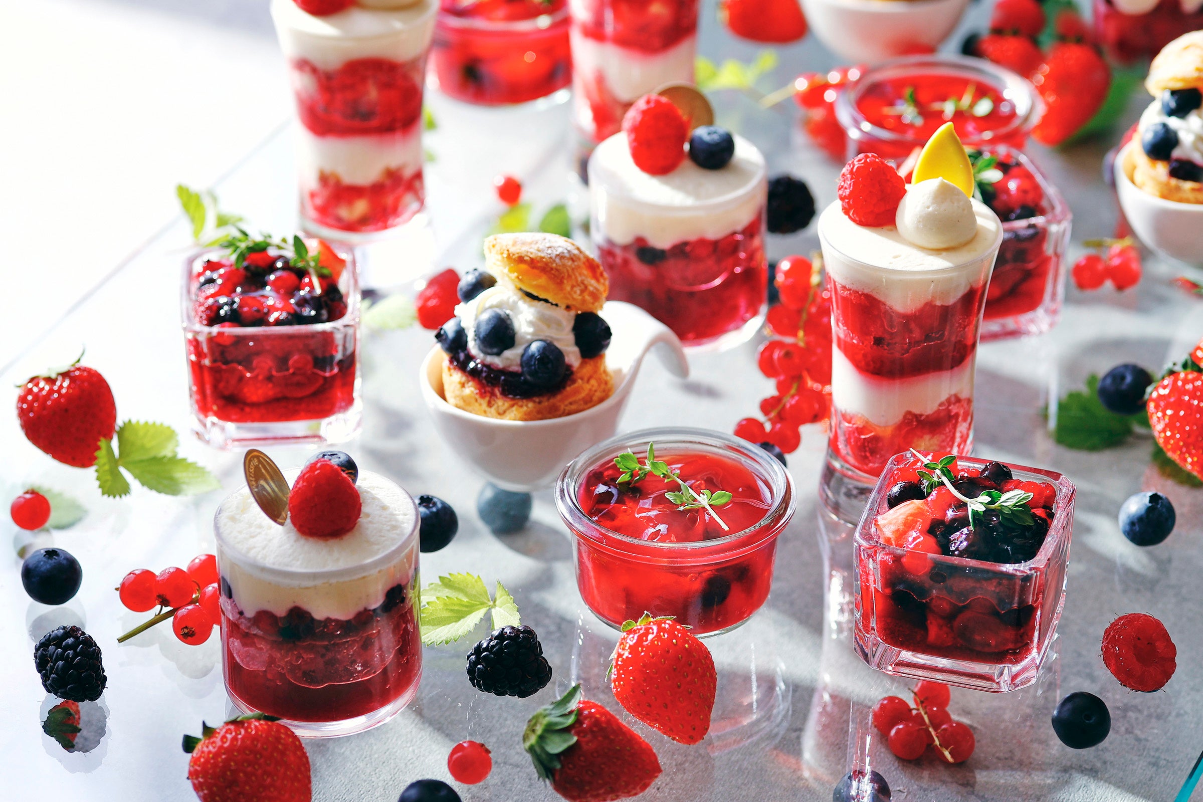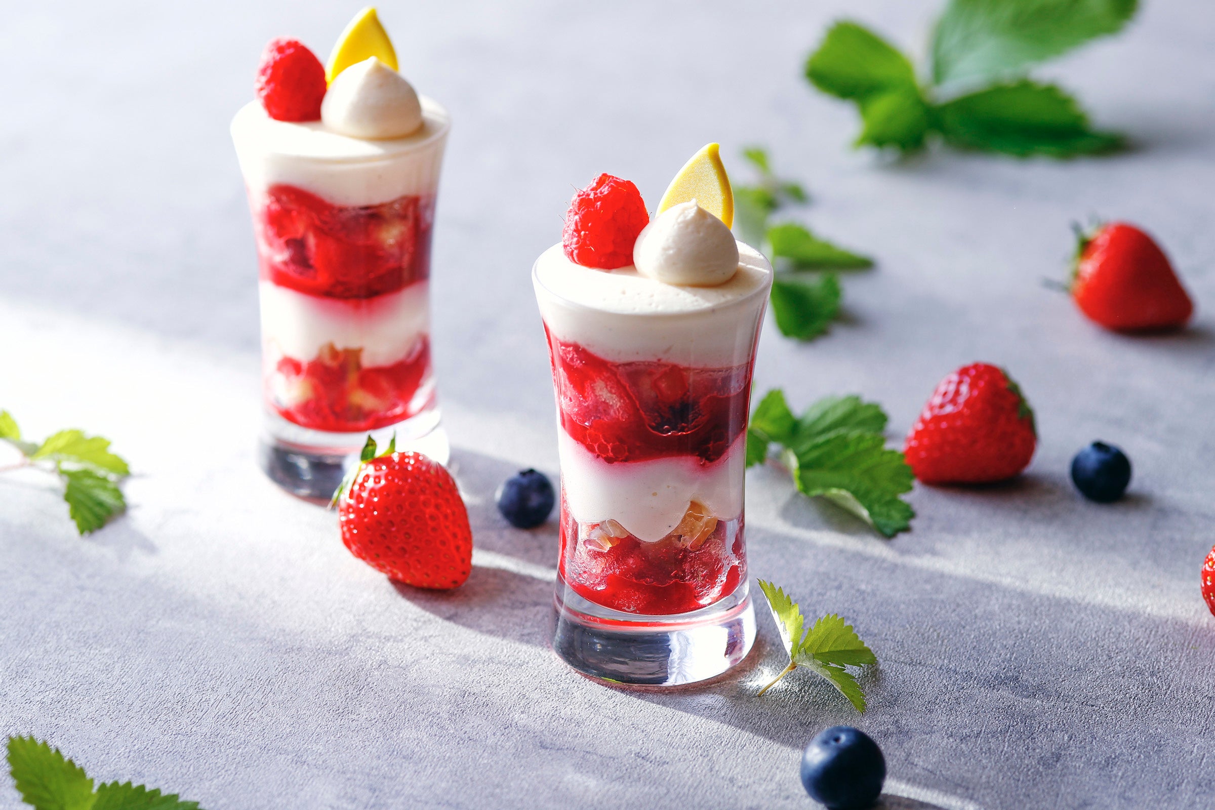 真赤なベリーにエルダーフラワーを香らせたエレガントなゼリーや、ラズベリーにレモンを合わせて爽やかに仕上げたショートケーキ、様々なベリーのマリアージュを楽しむ深紅が鮮やかなプディング、ブルーベリーと紅茶が香るトライフルなど、素材を美しく重ねたグラスデザートから、ベリーとチーズを絶妙なバランスで合わせた焼き菓子、ベリーの甘酸っぱさにココナッツを添えたスープ、ヨーグルトとベリーが風味豊かに響き合うドリンクまで、エグゼクティブペストリーシェフが一つひとつの素材を丁寧に組み合わせて創り上げたクリエイティビティ―溢れるデザートが、まるで宝石のように彩り鮮やかにブッフェ台いっぱいに並びます。