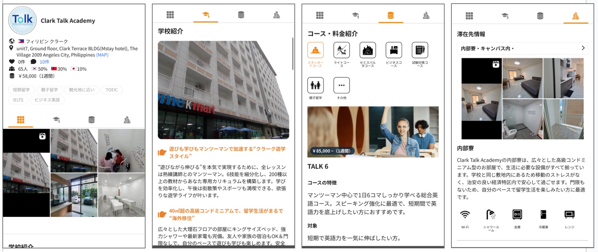 ネイティブキャンプ留学では、ユーザーが必要な情報を分かりやすく把握できるよう、常に丁寧で明確な情報提供を心がけています。Clark Talk Academyの詳細情報は、以下の4つのカテゴリーに分けて掲載しており、知りたい情報を的確にお届けします。