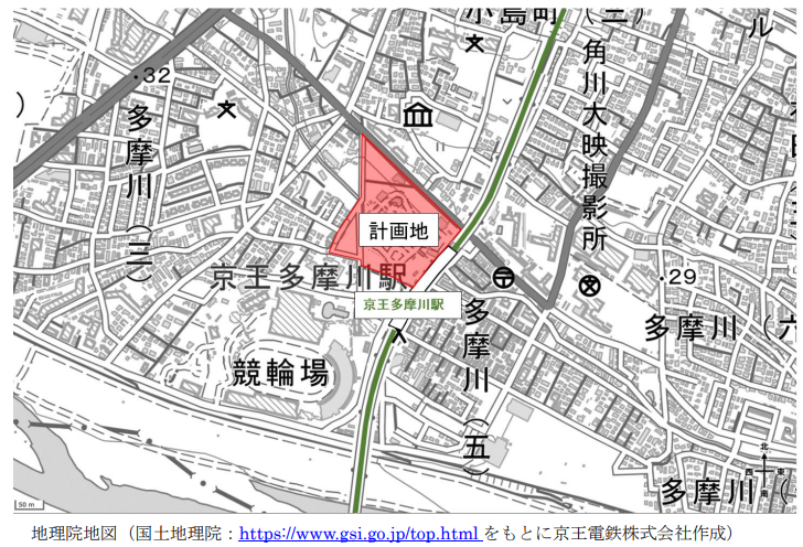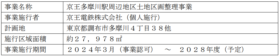本開発では、京王相模原線京王多摩川駅徒歩1分に立地する、旧京王フローラルガーデンアンジェ跡地ほか社有地を含む約2.8haの敷地において、土地区画整理事業により、道路の新設や既存道路の拡幅、公園の整備を実施します。