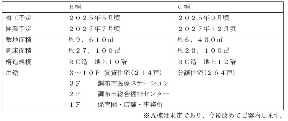 本開発の事業敷地内では、広場や歩行者空間を整備するほか、集合住宅、商業店舗、保育園、事務所、調布市福祉施設など多様な用途からなる、A棟・B棟・C棟の計3棟の建物を開発し、「住み継がれる、暮らし継がれる街」を目指して、京王グループとしての新たなまちづくりに取り組んでいきます。