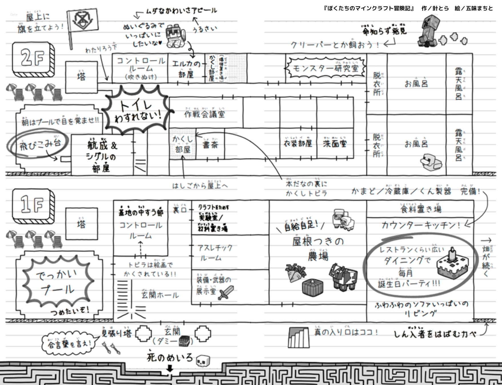 あらすじにある通り、盗賊の侵入を子どもが防ぐ、いわばマイクラ版ホームアローンのようなお話です。大人である盗賊の侵入を、子どもたちはどんな罠で防ぎ、追い払うのか!? しかも罠だらけのその家は、もともと子どもたちのヒミツ基地。夢いっぱいの設計図にも注目です。