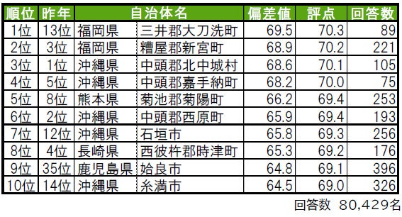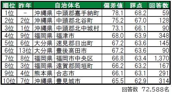 ●トップ10内では、1位の福岡県三井郡大刀洗町(昨年13位)、7位の沖縄県石垣市(昨年12位)、9位の鹿児島県姶良市(昨年35位)、10位の沖縄県糸満市(昨年14位)が昨年から順位を上げてトップ10入りしています。