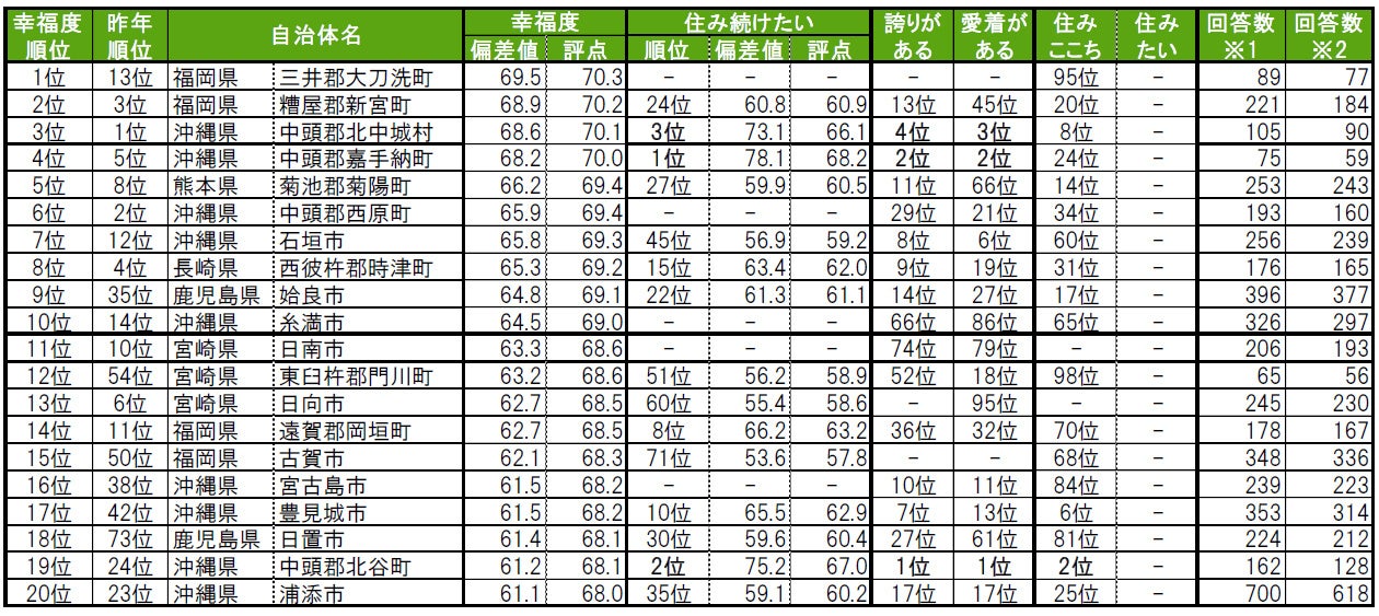 街の幸福度は、1位福岡県三井郡大刀洗町、2位福岡県糟屋郡新宮町、3位沖縄県中頭郡北中城村。