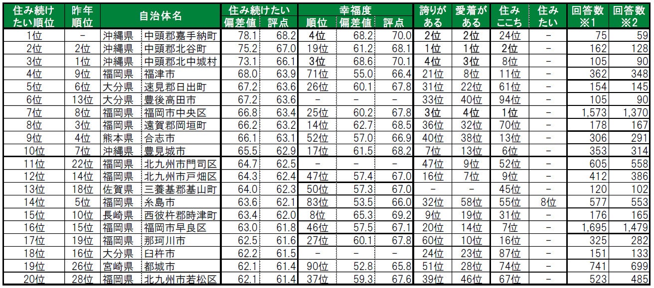 1位は福岡県三井郡大刀洗町で、昨年13位から大きく順位を上げました。2位は、福岡県糟屋郡新宮町で、トップ2は福岡県の郡部に属する「町」となっています。3位沖縄県中頭郡北中城村で、「住み続けたい街」「街に愛着がある」でも3位、「街に誇りがある」では4位となっています。