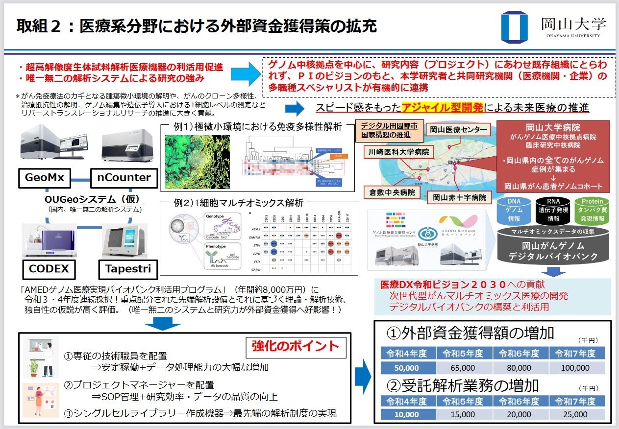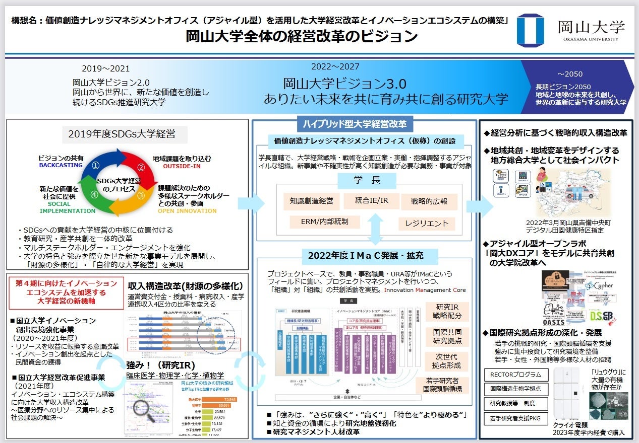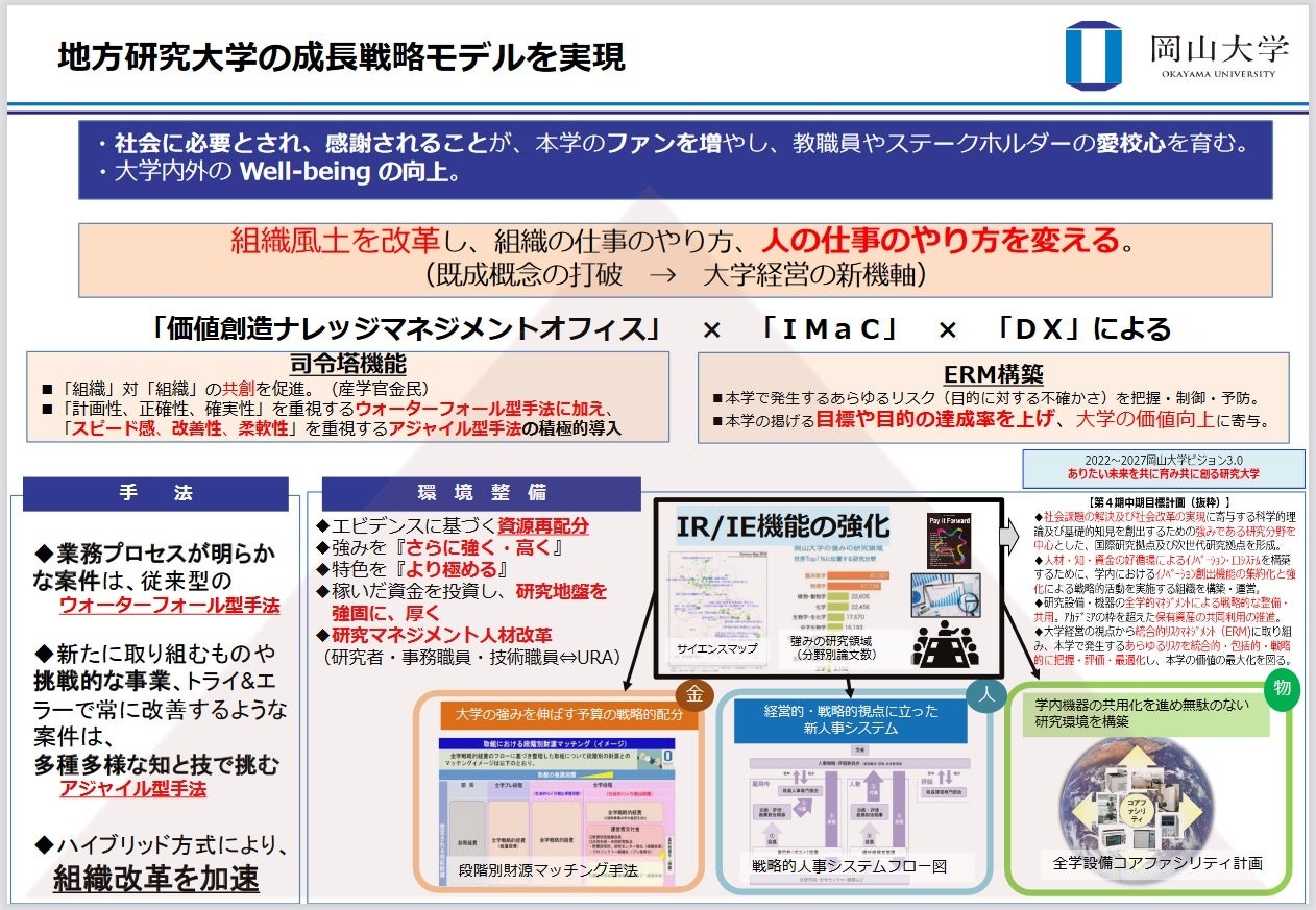 採択された岡山大学の事業構想では、岡山大学長期ビジョン「地域と地球の未来を共創し、世界の革新に寄与する研究大学」の実現に向け、強みの研究分野への重点投資による外部資金獲得実績を通じ資金の好循環を実現し、教育研究の活性化を図ること、及び先行実施するアジャイル型運営組織である「IMaC(イノベーション・マネージメント・コア)」に加え、大学経営の戦略・戦術を先導する「価値創造ナレッジマネジメントオフィス」を学長直下に創設し、組織イノベーションを加速させることとしております。