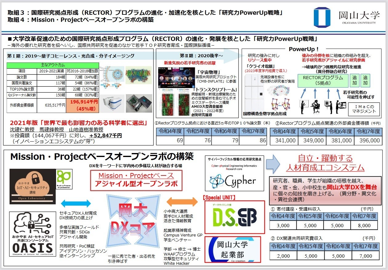 岡山大学は、内閣府の令和2~3年度「国立大学イノベーション創出環境強化事業」及び岡山大学の令和3年度「国立大学経営改革促進事業」で進めてきた大学経営改革をさらに加速させ、学長のリーダーシップによる全学的な実施体制のもと、新たな価値の創出と社会課題の解決を強力に進めて参ります。
