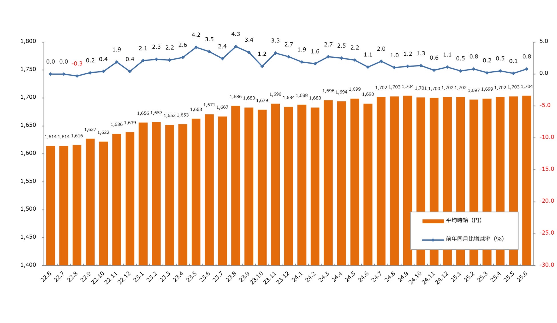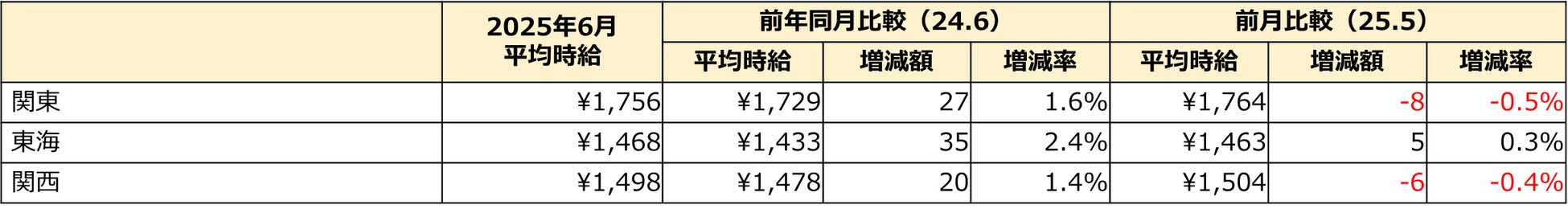 2025年6月度の三大都市圏平均時給は1,704円(前月比+1円・0.1%増、前年同月比+14円・0.8%増)でした。前年同月を上回るのは34ヵ月連続で、1,700円台は3ヵ月連続。また全職種、三大都市圏全エリアで前年同月を上回りました。