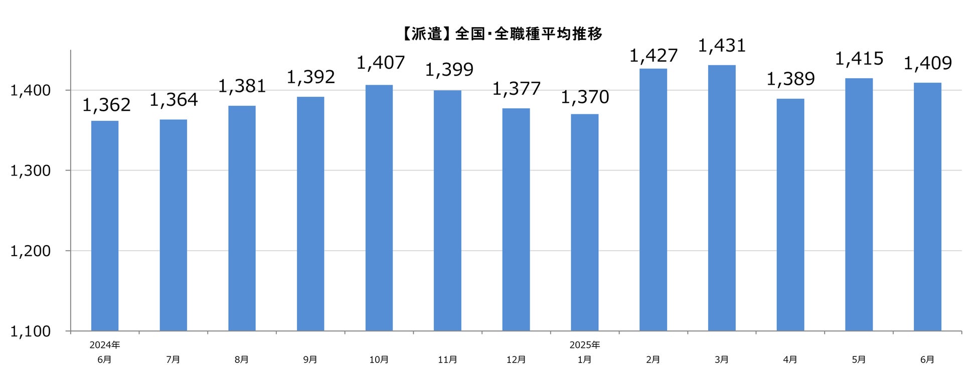 【派遣】全国・全職種平均時給は1,409円。前月比ー6円。前年同月比+47円。